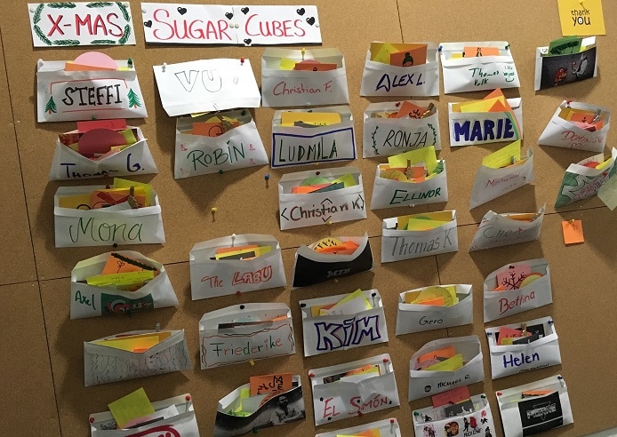 Schon zum zweiten Mal haben wir bei uns im Büro in den Wochen vor unserer Weihnachtsfeier eine Wand mit kleinen privaten "Briefkästen" aufgehängt. Eine schöne Tradition, die ich noch von meiner aktiven Zeit in der Studentenorganisation AIESEC kenne.