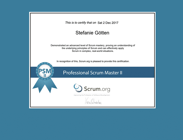 Ende 2017 habe ich mit 94% erfolgreich die PSM II Prüfung abgelegt. PSM II arbeitet mit ausführlicheren Fragen, es wird wesentlich konkreter und zielt auf das „echte Leben“ mit aus der Praxis bekannten Szenarien ab.