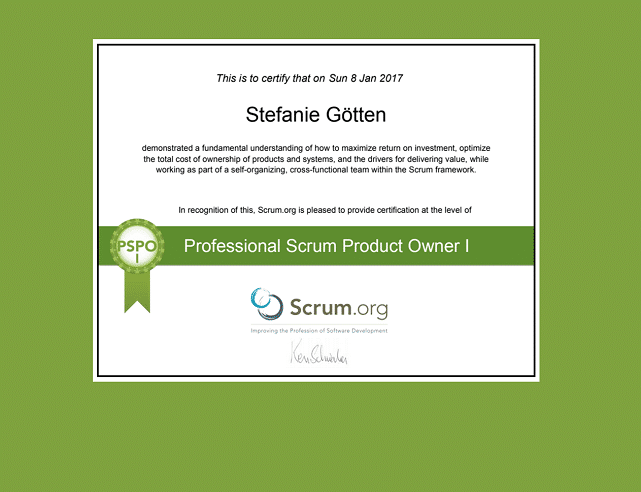 In 2016 habe ich mich nach einem Seminar in Amsterdam mit Gunther Verheyen an PSPO I gewagt. Als Agile Coach unterstütze ich die Product Owner in unserem Unternehmen bei ihrer täglichen Arbeit, daher lag dieser nächste Schritt für mich auf der Hand.